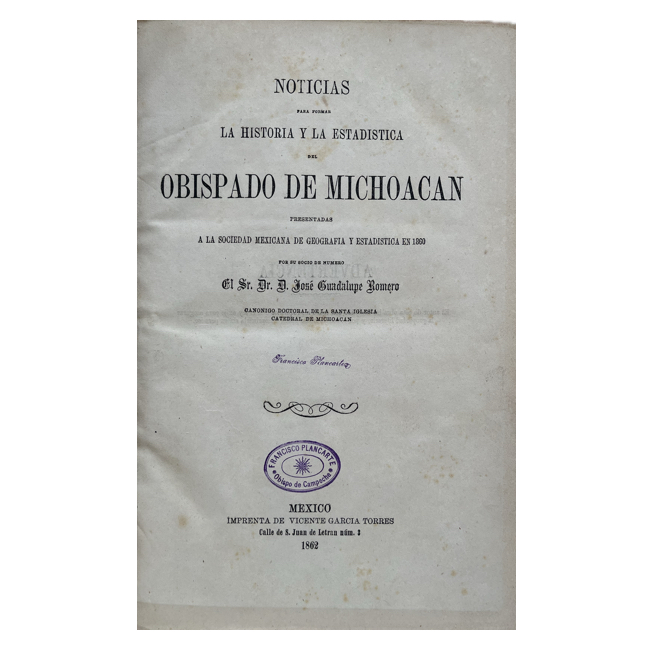 1862. ROMERO, José Guadalupe. “Noticias para formar la Historia del Obispado de Michoacán”
