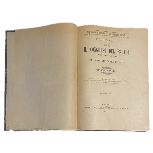 1912. “Código Civil declarado vigente por el H. Congreso del Estado de Oaxaca, el 14 de diciembre de 1887”