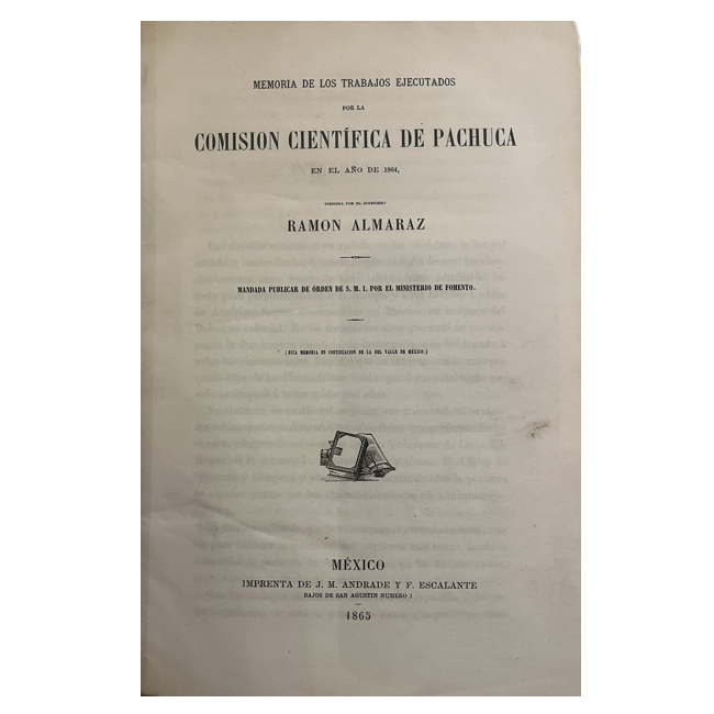 1865. ALMARAZ, Ramón. “Memoria de los Trabajos Ejecutados por la Comisión Científica de Pachuca en el Año de 1864”