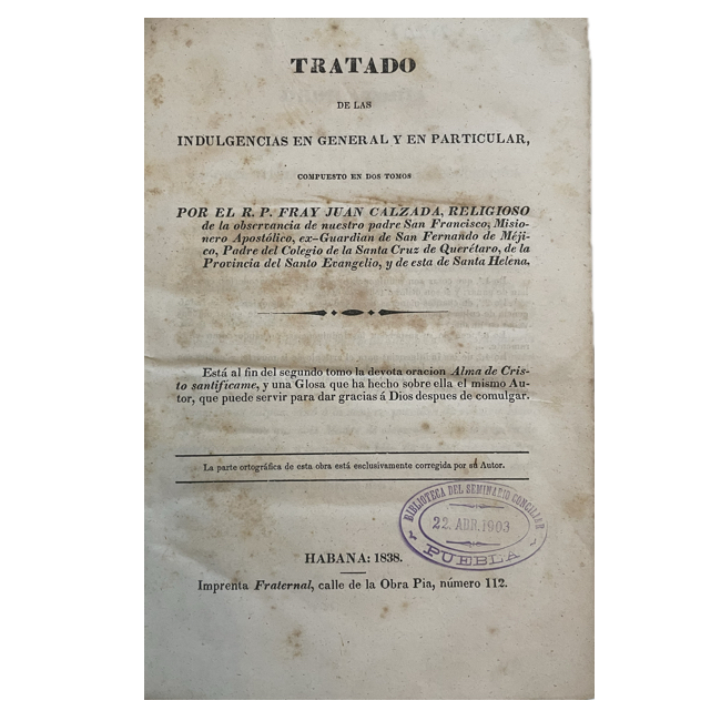 1838-1840. CALZADA, Fr. Juan. “Tratado de las Indulgencias en General y en Particular”