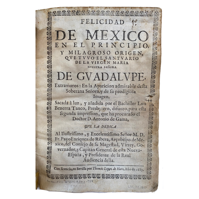 1683. BEZERRA TANCO, Luis. “Felicidad de México en el Principio y Milagroso Origen que Tuvo el Santuario de la Virgen María N. Señora de Guadalupe…”