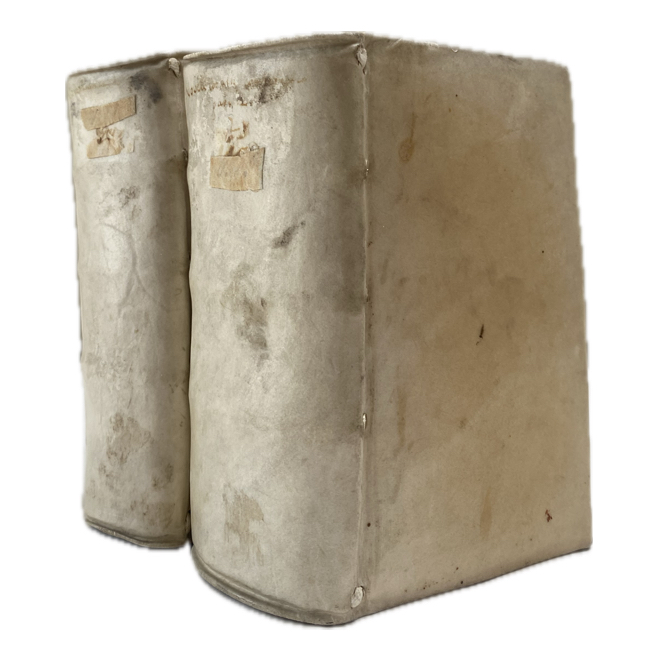 12º. 2 Vol. (32), 841 p.; 1376 p. Encuadernados de manera unoforme en pergamino de época, con orillas tipo “Yapp”; títulos manuscritos en lomos; ligero desgaste en extremos. Cada tomo con página de título individual, con títulos impresos dentro de un hermoso borde arquitectónico grabado en madera; letras capitulares y viñetas ornamentales a lo largo de los textos. El diseño del grabado se asemeja a un arco triunfal o un pórtico clásico, una estructura simbólica que resalta la autoridad y la solidez del derecho romano. Dos cariátides (mitad mujer, mitad columna) sostienen la estructura superior, en la que se ve una máscara de figura mitológica; abajo, querubines.