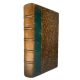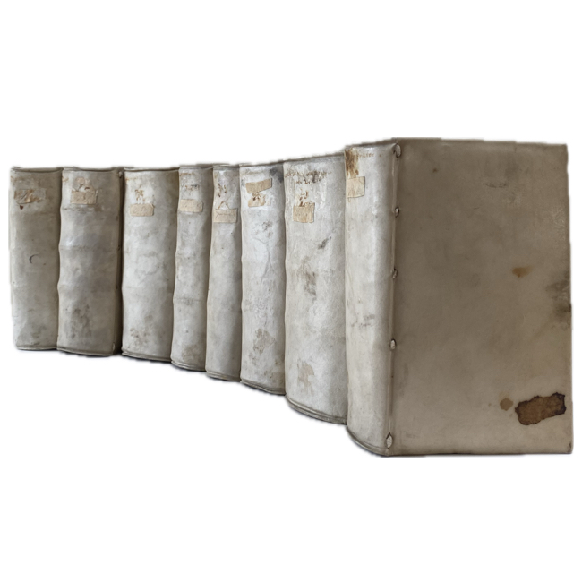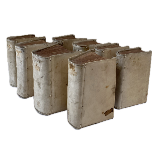 12º. 8 vol. Encuadernados de manera uniforme en pergamino de época con orillas tipo “Yapp”; títulos manuscritos en lomos; pequeñas etiquetas de papel pegadas en parte superior de lomos; ligero desgaste en extremidades, pero generalmente limpios. Cada tomo con página de título individual, impresos dentro de un hermoso borde arquitectónico grabado en madera: El diseño se asemeja a un arco triunfal o un pórtico clásico, una estructura simbólica que resalta la autoridad y la solidez del derecho romano. Dos cariátides (mitad mujer, mitad columna) sostienen la estructura superior, en la que se ve una máscara de figura mitológica; abajo, querubines; letras capitulares y viñetas ornamentales a lo largo de los textos.