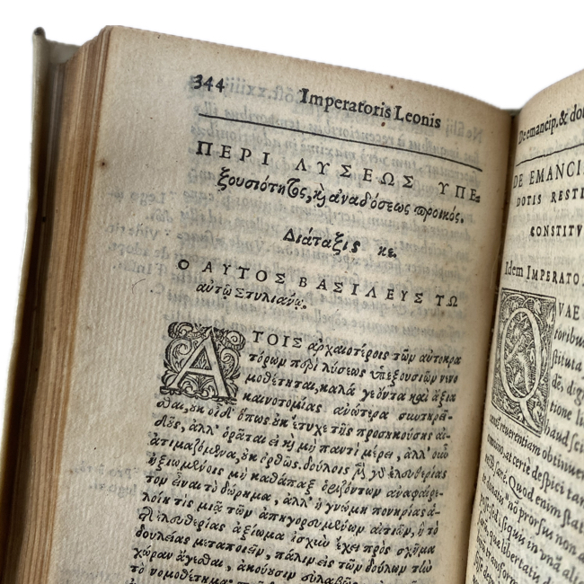 Contenido: Novelas imperiales de Justiniano, con la antigua traducción y el texto griego por primera vez impreso en esta edición y Segunda parte de las Novelas, con las cinco “collationes” adicionales.