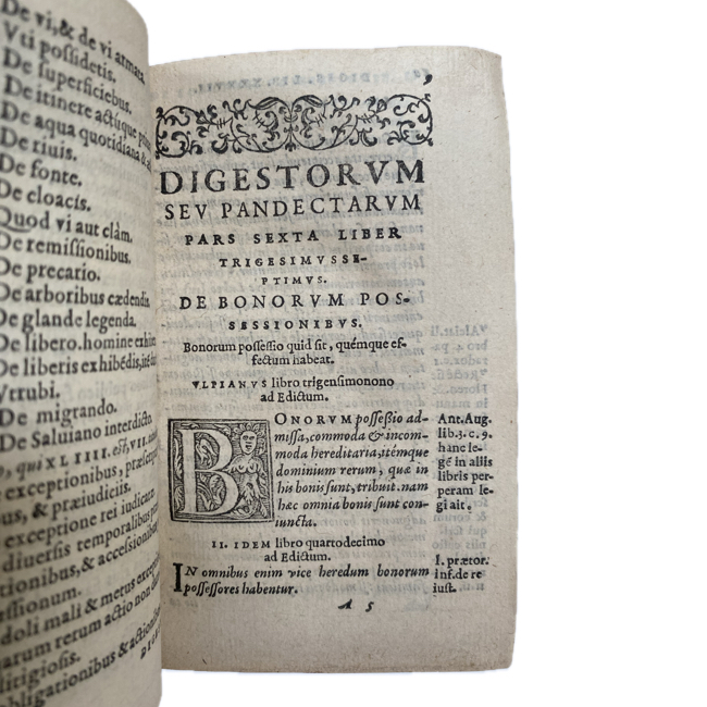 Nota: Forma la base del derecho civil romano. Edición humanista de gran calidad tipográfica y jurídica.