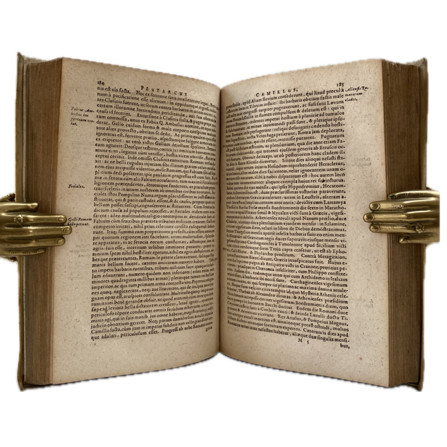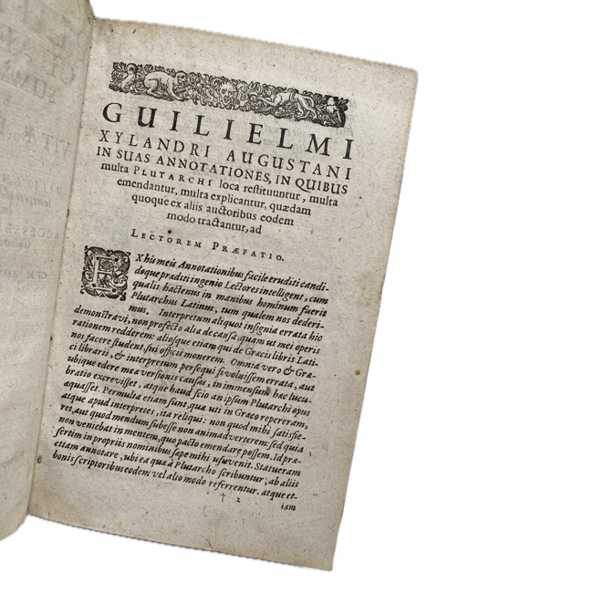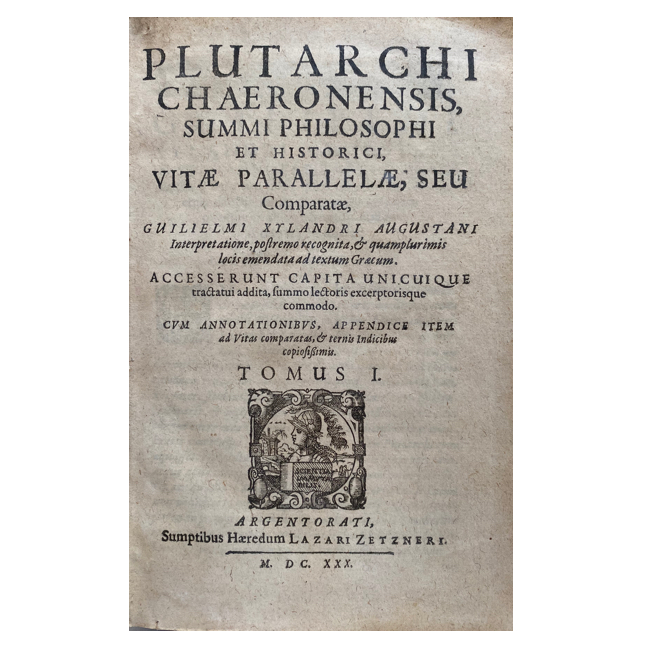Título original en latín: Summi Philosophi et Historici Vitae Parallelae, seu Comparatae. Guillermi Xylandry Augustani interpretatione, postremo recognita & quamplurimis locis enmendata ad textum gracum. accesserunt capita unicuique tractatui addita , fummo lectoris excerptorisque commodo cum annotationivus, apendice item ad vitas comparatas & ternis indicibus comiosissimus.