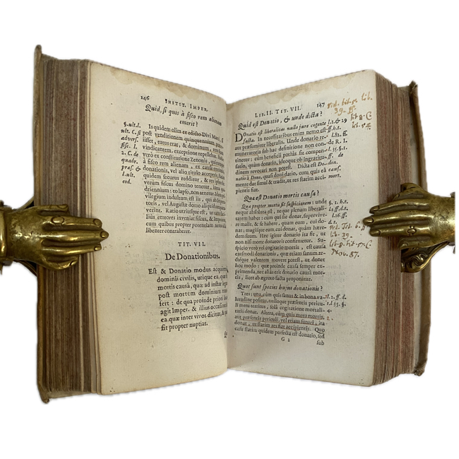 Sexta edición de este comentario a las Institutiones (Institutas) del emperador romano Justiniano I, un texto fundamental del Corpus Iuris Civilis, estructurado en forma de preguntas y respuestas (erotemata) para facilitar la enseñanza. Fue muy difundida en las universidades europeas del siglo XVII y se convirtió en una herramienta clave para la formación jurídica humanista, combinando claridad pedagógica con rigor en la tradición del derecho romano.