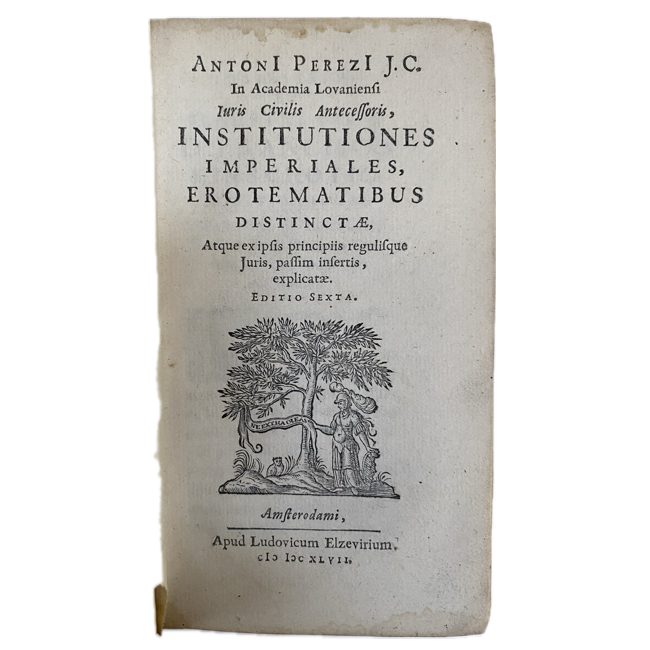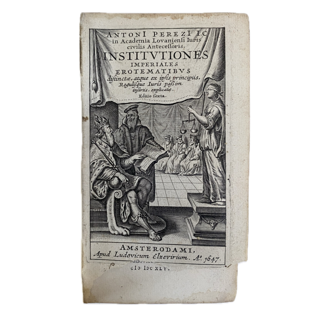 Antonio Pérez, más conocido en latín como Antonius Perezius, fue un destacado jurista español nacido en 1583 en La Rioja, en el norte de España. En Lovaina, fue nombrado profesor regio de las Instituciones en 1619 y ocupó la cátedra del Código ese mismo año. Sus comentarios sobre el derecho romano se consideran aportes originales a la teoría legal, especialmente en el ámbito del derecho público, y gozó de gran prestigio en la corte española, donde fue nombrado consejero real. Hacia el final de su carrera, emitió un fallo favorable a Luis XIV en un litigio contra España, lo que irritó a Felipe IV. Perezius falleció en 1672 y es recordado por obras como las Institutiones Imperiales (presente obra).