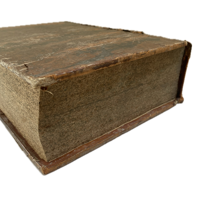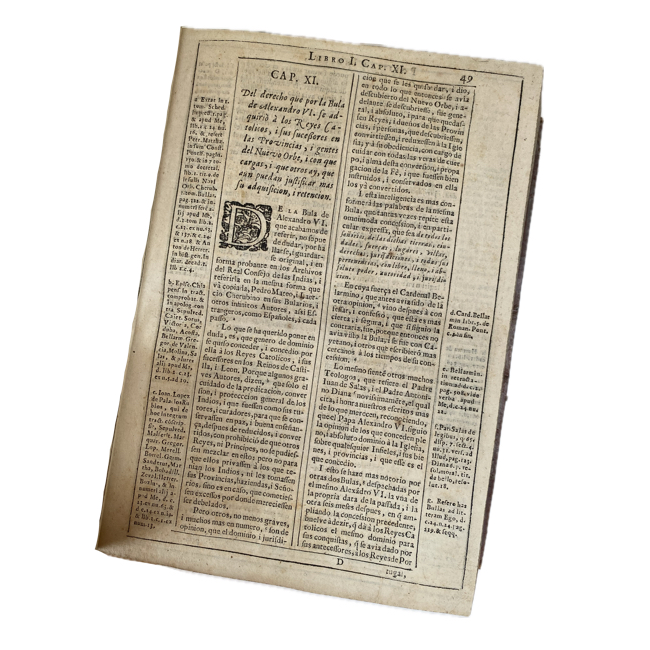 Folio. [46], 1040, [104] p. Encuadernación en piel española, siglo XIX; bisagras cansadas, han sido reforzadas, las pastas con desgaste. Faltante marginal en últimas tres hojas, con mínima afectación en texto (índice). Errores de pag., de p. 653 pasa a 656, las p. 797 y 798 se repiten. Página de título fileteada; textos a dos columnas y fileteado; apostillas marginales en latín. Falta frontispicio con grabado calcográfico y falta retrato de autor.