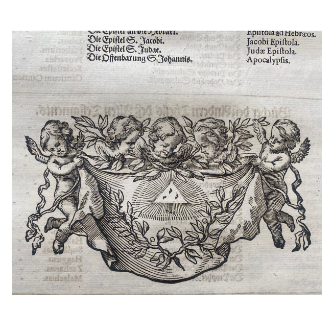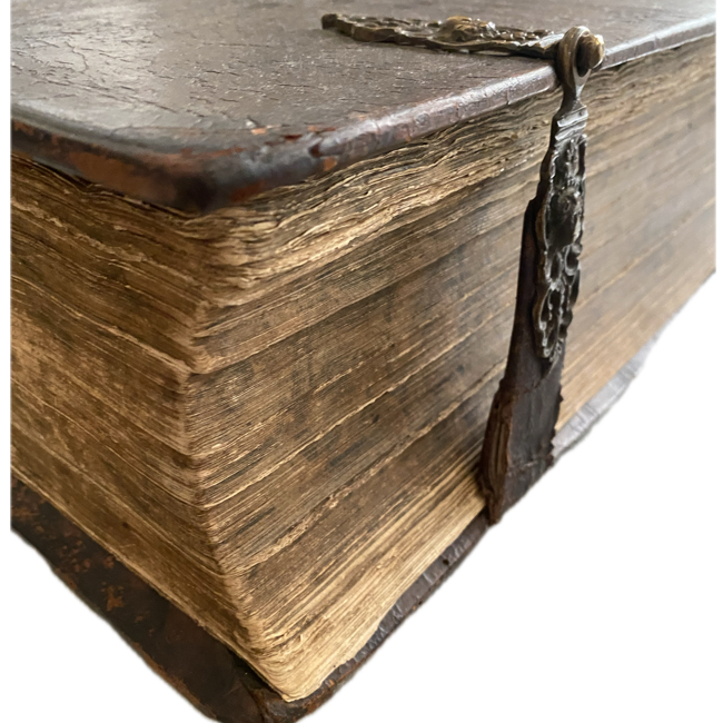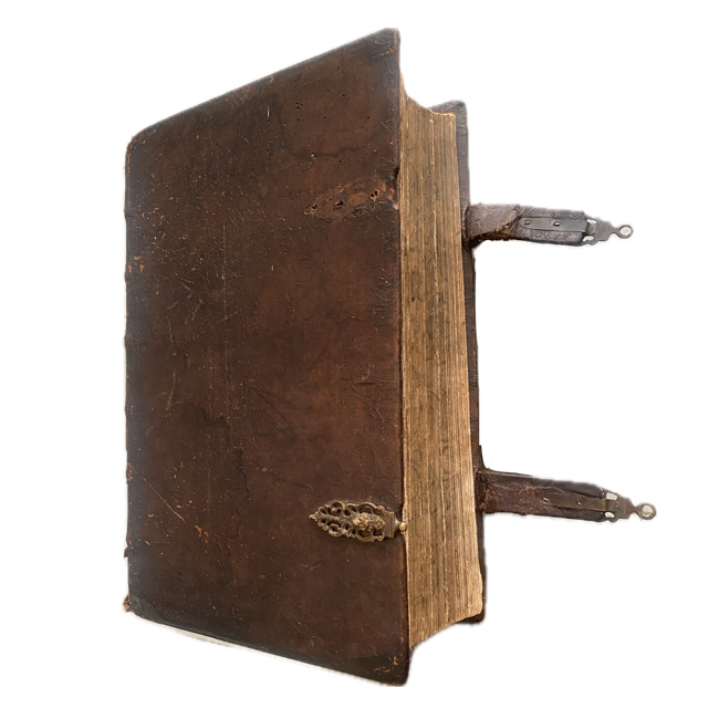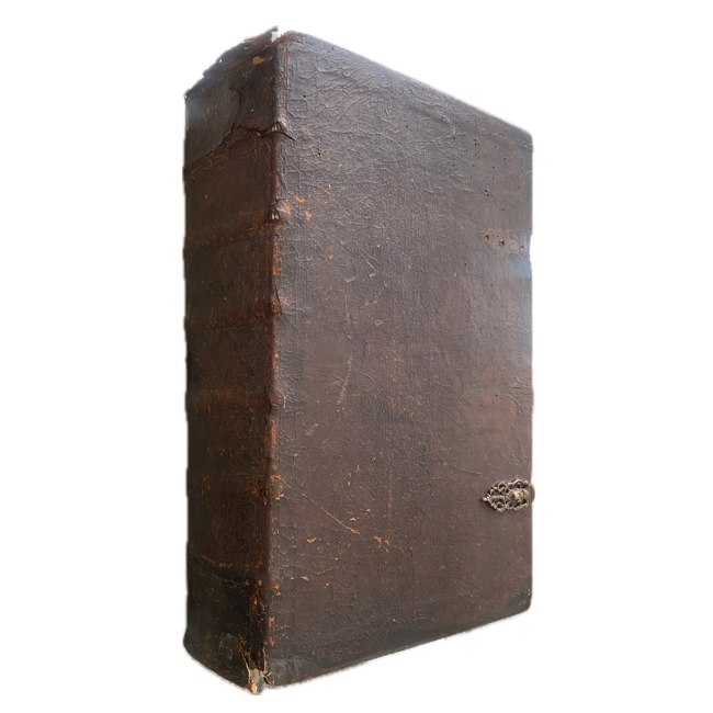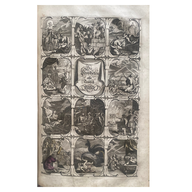 Gran folio (46 x 30 cm). (38), (22), (66), 686, 950, (18) pp. Encuadernación de época en plena piel. Desgaste en la parte superior del lomo. Dos compartimentos con reparaciones antiguas. Pequeño desgarre cerrado en la base del lomo; restos de dorado antiguo y título en el lomo; 3 (de 4) broches de latón. Página de título grabada y página de título impresa en rojo/negro. Algunas manchas ligeras en las primeras hojas; humedad en el margen inferior de las últimas cinco hojas; algunas hojas al inicio y al final ligeramente desgastadas en los márgenes derechos; pérdida de blanco en márgenes en algunas hojas. Internamente, por lo general limpio y en buen estado. Con 42 grabados (incluyendo portada general y retrato de Lutero) y 1 escudo de armas grabado (retratos, apóstoles, láminas, portadas parciales, planos, mapa, etc.). Algunas láminas con manchas de humedad marginales.