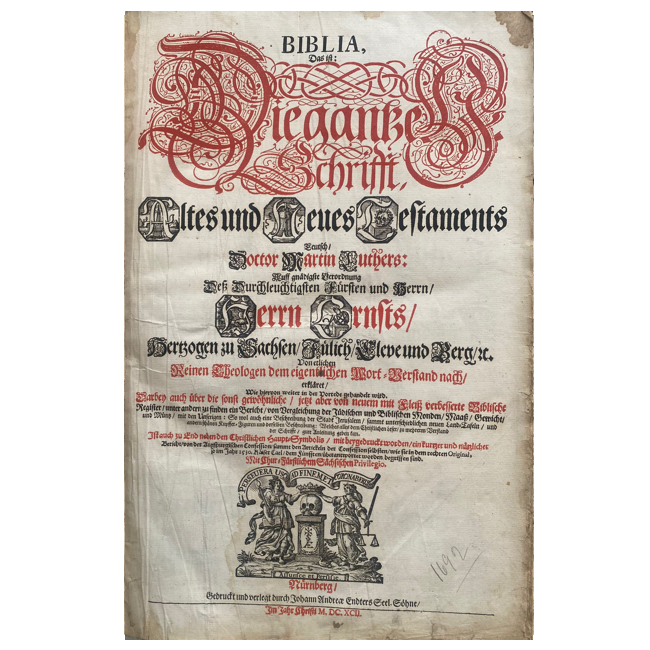 Esta llamada “Biblia de Weimar” o “Biblia Ernestina” se imprimió por primera vez en 1641 y tuvo 13 ediciones hasta 1792. Esta edición de 1692 corresponde a la 5ª edición y fue impresa por la familia Endter en Núremberg. Se caracteriza por su gran formato (folio), encuadernación en piel, y una rica iconografía. También contiene comentarios teológicos y una exposición de la Confesión de Augsburgo.