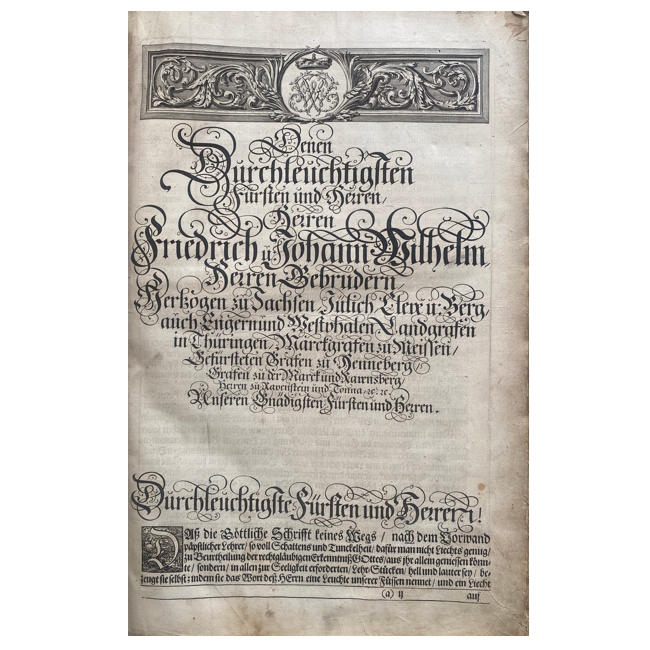 La Weimarer Kurfürstenbibel o Biblia Ernestina de Weimar es una de las ediciones más representativas de la traducción de Martín Lutero al alemán. Publicada por primera vez en 1641, fue utilizada por los príncipes electores como Biblia oficial y educativa en sus territorios. Contiene el texto completo del Antiguo y Nuevo Testamento en alemán, acompañado de comentarios de teólogos competentes que explican el sentido literal de las Escrituras, los principales símbolos cristianos y una breve exposición de la Confesión de Augsburgo. Además, incluye numerosas láminas grabadas y retratos que enriquecen visualmente la obra. Esta edición refleja la influencia religiosa, educativa y política del luteranismo en los estados alemanes del siglo XVII y XVIII.