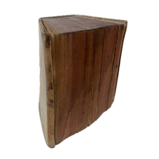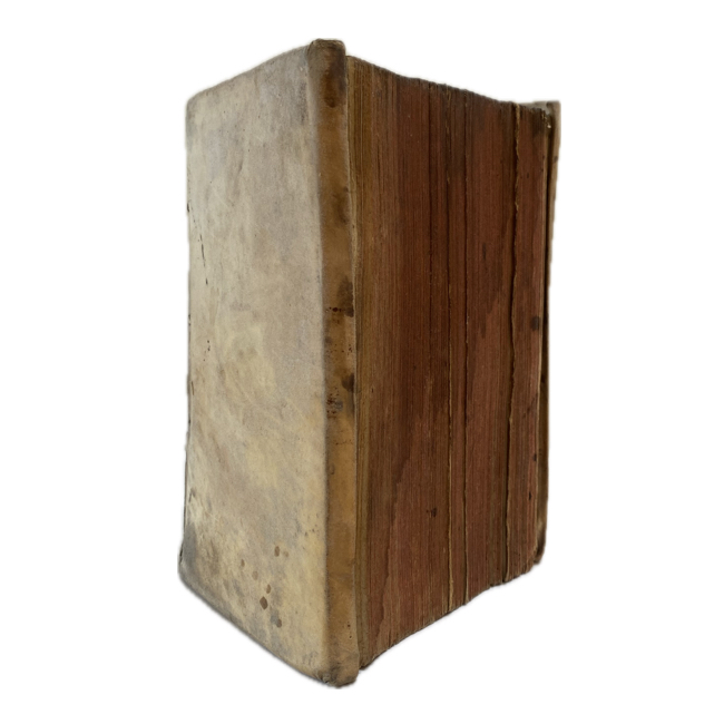 8º. Tres tomos en un volumen: [8] h, 448 p.; 416 p.; 428 p. Pergamino de época completo algo desgastado; título manuscrito y etiqueta manuscrita pegada en el lomo. Anotaciones de propiedad en latín en guarda frontal y en el reverso de guarda delantera. Algunas manchas de óxido (foxing). Frontispicio alegórico grabado; tres páginas de título independientes, parte II y parte III con grabado del impresor.