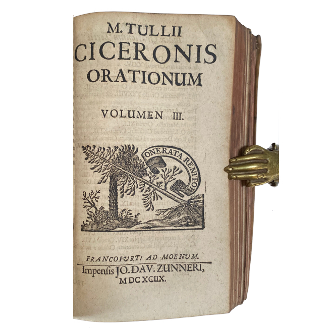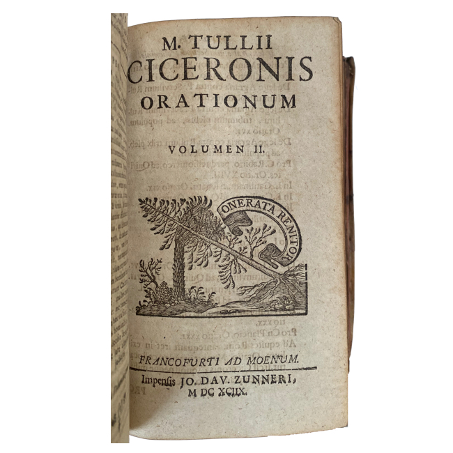 El frontispicio muestra al centro: el busto de Cicerón, laureado en el pedestal central como símbolo de la eloquentia y la sapientia romana. El laurel indica su triunfo en el arte de la oratoria y de la razón. A los lados, , dos figuras femeninas coronadas que representan probablemente a la Retórica, con la lanza y el gesto didáctico (enseñar, convencer) y la Sabiduría o la Justicia, con el cetro (poder legítimo) y la corona, indicando que el discurso de Cicerón es a la vez racional y moralmente fundado.