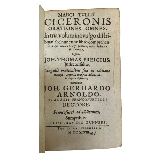 Todas las oraciones, comúnmente distribuidas en tres volúmenes, pero ahora reunidas en un solo libro, conservando el análisis general lógico, histórico y retórico, que Juan Tomás Freigius, jurisconsulto, antepuso a cada oración en su edición y anotó en los márgenes, divididas en capítulos, cuidadosamente preparado por Juan Gerardo Arnoldo, rector del Gymnasium de Frankfurt.
