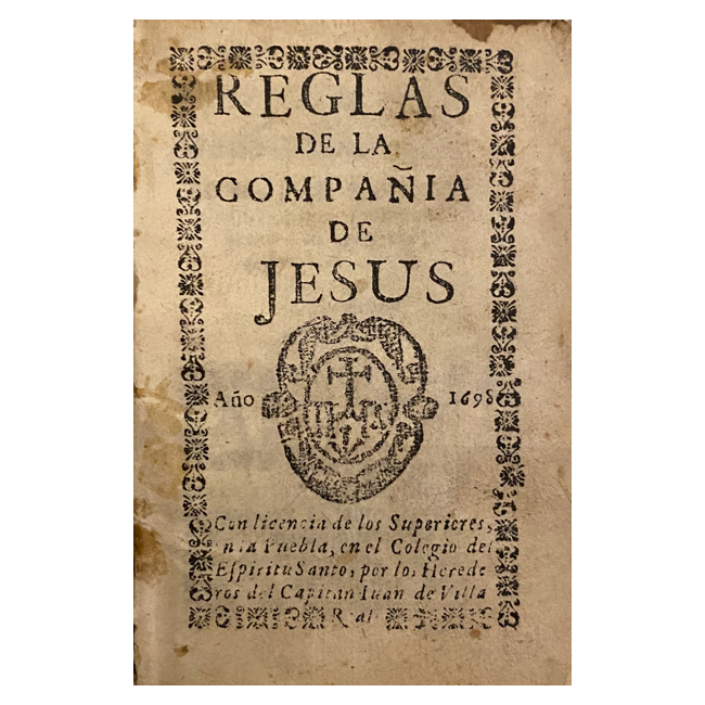 1. Reglas de la Compañía de Jesús. Puebla, Herederos del Capitán Juan de Villa, 1698