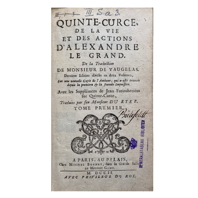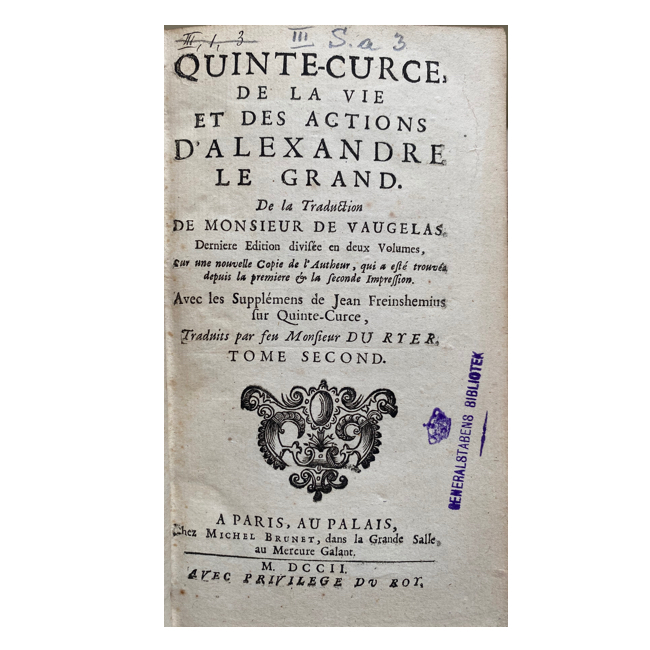 Quinto Curcio Rufo fue un historiador romano del siglo I. La única obra que se le conoce es Historiae Alexandri Magni Macedonis (Historias de Alejandro Magno de Macedonia), una biografía de Alejandro Magno en diez libros, y es una de las principales fuentes clásicas sobre Alejandro Magno. Los dos primeros libros están perdidos, y los ocho restantes incompletos, por lo que el texto inicia con el libro III. La obra, transmitida de forma incompleta, fue muy influyente en la historiografía y en la tradición literaria renacentista y barroca. La traducción francesa de Vaugelas, publicada originalmente en 1653 y revisada en ediciones posteriores como esta de 1702, tuvo gran difusión y prestigio por la elegancia de su estilo. Los suplementos de Johann Freinsheim completan los pasajes perdidos del texto original, consolidando esta versión como una de las más leídas en la Europa del siglo XVII y XVIII.
