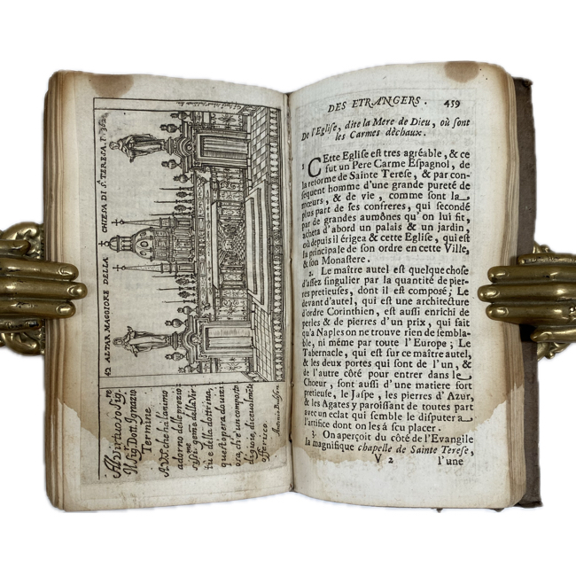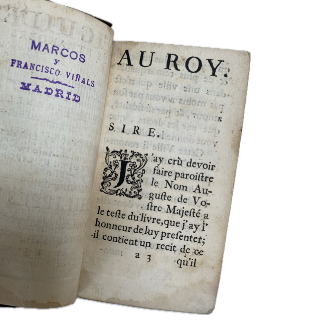 8º menor. Frontispicio (Felipe V), [5] h., 539 p. Pasta suave en cartoncillo; rotura al frente y desgaste en bisagras. Mancha de humedad a lo largo de textos, sin afectación; en h.2 un sello de antiguo propietario. 34 grabados en página completa, fuera de paginación (una plegable).