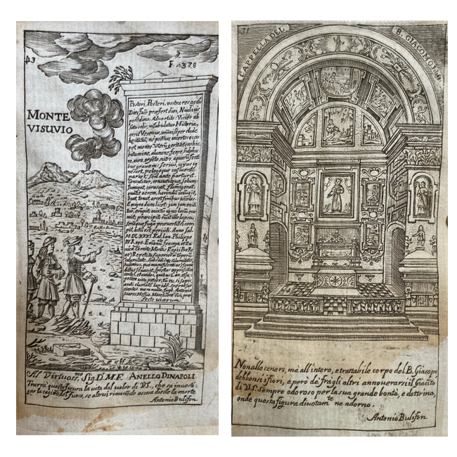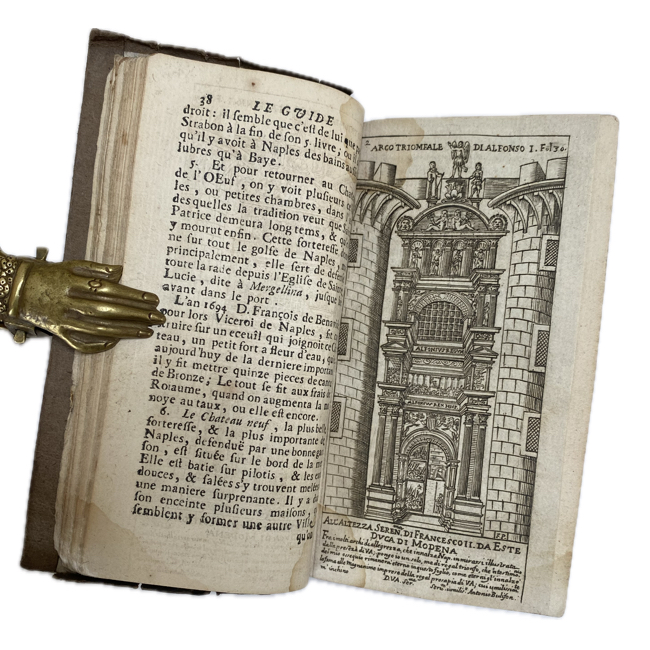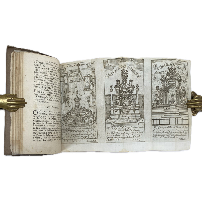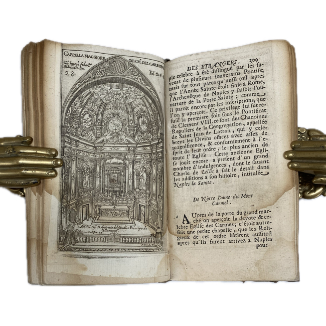 Describe los edificios sagrados (iglesias y monasterios), palacios públicos y monumentos históricos de la ciudad (Villa) de Nápoles. Textos en francés