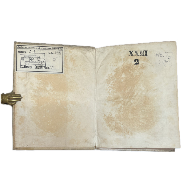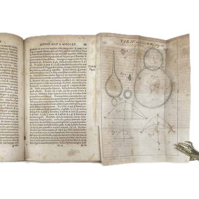 4º. [1] h., 549 p. Pergamino de época; título manuscrito en lomo; pequeña etiqueta amarilla en parta superior de lomo. Sellito. en página de título y en guarda; etiqueta de librería en guarda. Manchas de óxido en textos. En total 8 láminas desplegables grabadas, fuera de paginación. Contiene la primera publicación de Bernoull sobre las propiedades del péndulo (p. 242)