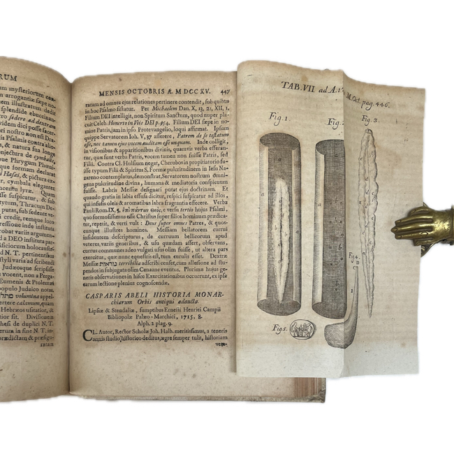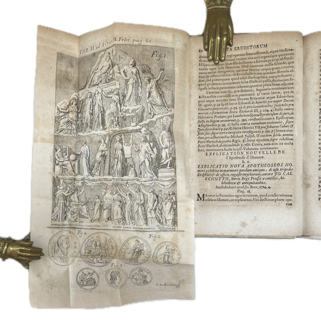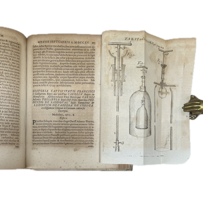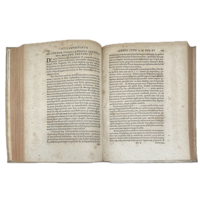 Importante volumen de la célebre revista científica alemana Acta Eruditorum, que reúne contribuciones en matemáticas, física y ciencias naturales. Contiene la primera publicación de Johann Bernoull sobre las propiedades del péndulo (p. 242). “De centro Turbinationis inventa nova”