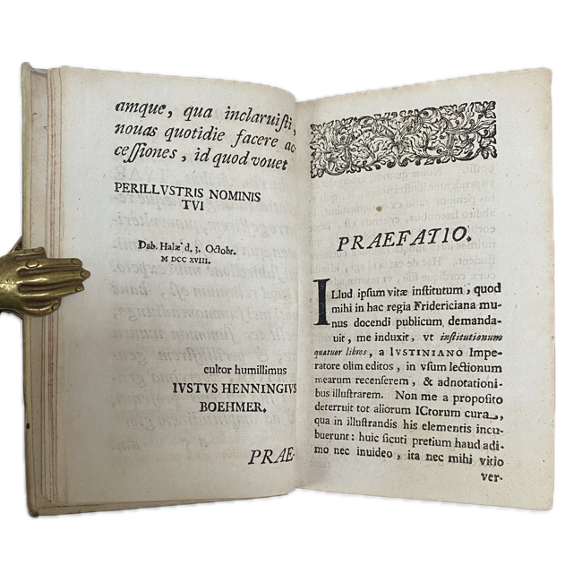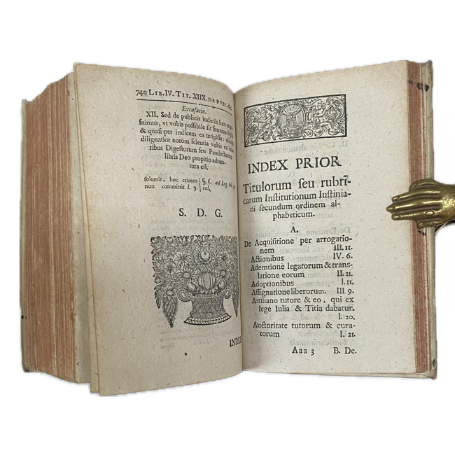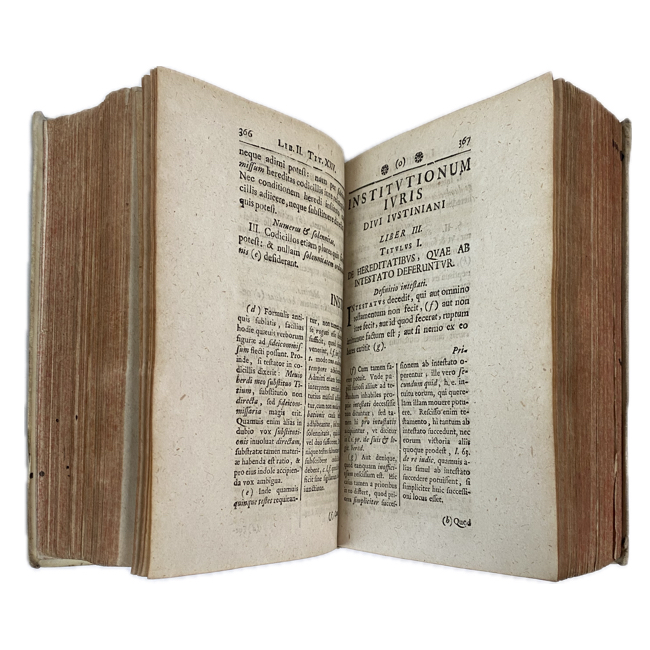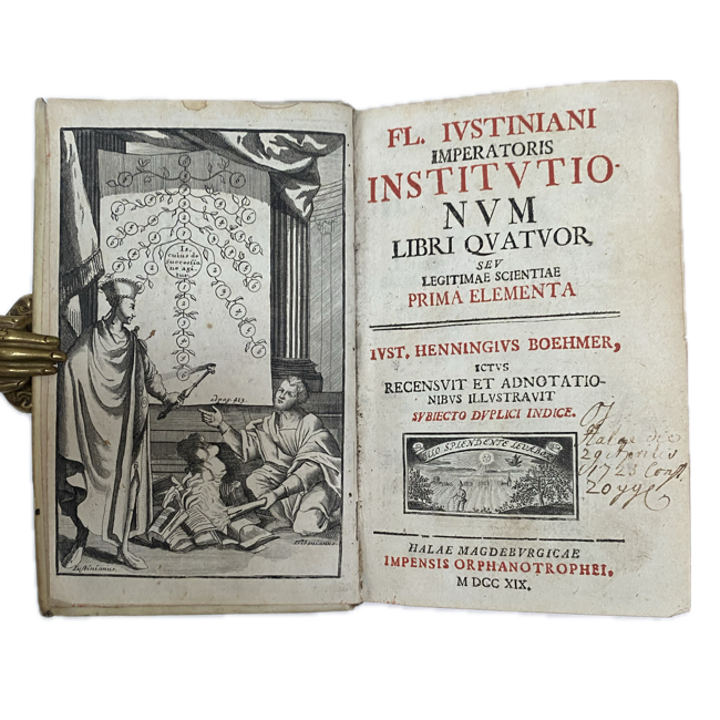 1719. JUSTINIANO, Emperador . “FL. Iustiniani Imperatoris Institutionum libri quatuor seu Legitimæ Scientiæ Prima Elementa”.