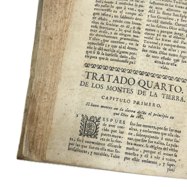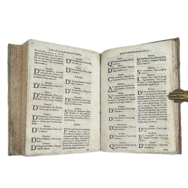 8º. [4] h., 324 p., [8] h. Pergamino de época; título manuscrito en lomo; pastas gastadas pero sin daños. Marco tipográfico en página de título; rastro de humedad en esquina inferior presente en primeras 18 hojas, sin afectar textos; foxing moderado a lo largo de textos; hoja con rotura en esquina con poca afectación de texto (p.147); rotura en hoja (p.215) que ha sido reparada profesionalmente; letras capitulares y viñetas ornamentales. Textos a dos columnas