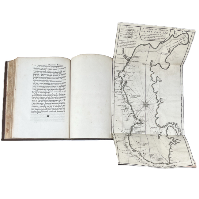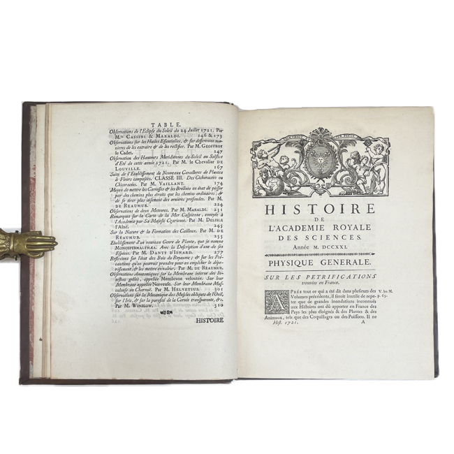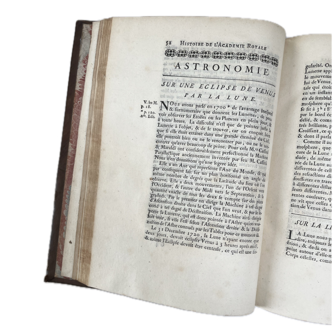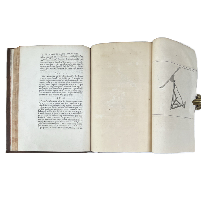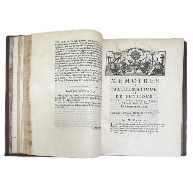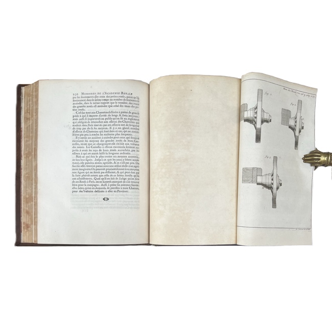 Recopilación anual de memorias de la Académie Royale des Sciences que reúne trabajos originales en astronomía, física, matemáticas, química, botánica y anatomía, reflejando el estado de la investigación científica francesa en los primeros años del reinado de Luis XV. Los artículos, firmados por algunos de los principales académicos del momento, combinan observación empírica, experimentación y desarrollo teórico. Las láminas plegadas, cuidadosamente grabadas, ilustran instrumentos, fenómenos y demostraciones, complementando los textos y evidenciando el carácter práctico y analítico de la obra.