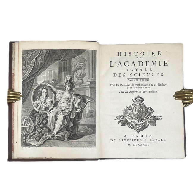El volumen abre con un frontispicio grabado de carácter alegórico en el que una figura femenina —identificable con la Ciencia o Minerva— presenta el retrato ovalado de Luis XV, subrayando el vínculo entre el saber científico y la autoridad monárquica en los inicios de su reinado. A sus pies se disponen diversos instrumentos (globo, compases, esfera armilar), aludiendo a las disciplinas cultivadas por la Academia. La escena, enmarcada por arquitectura clásica y cortinaje, responde al lenguaje visual de la Ilustración temprana, donde la ciencia aparece como garante de orden y prestigio. En la página de título figura el emblema de la Académie Royale des Sciences: un globo terráqueo rodeado de instrumentos y coronado, acompañado de guirnaldas de laurel, imagen que sintetiza la aspiración de conocimiento universal bajo patrocinio real.
