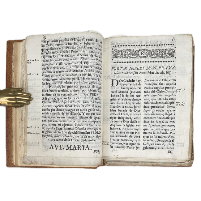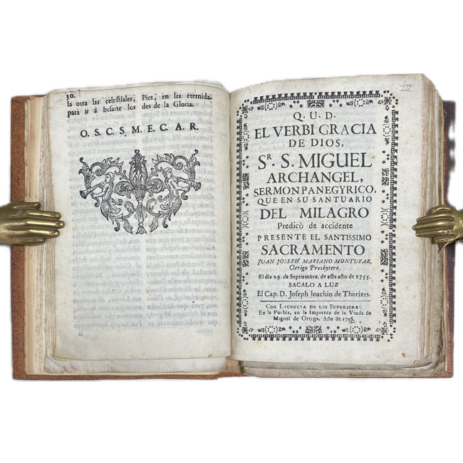 Sammelband original del siglo XVIII, no facticio moderno, que incluye dos sermones guadalupanos tempranos (1744 y 1765). También presencia de impresos de los talleres más importantes de la Nueva España: Hogal, Ortega, San Ildefonso, Biblioteca Mexicana y Superior Gobierno. Dos piezas dedicadas a Fray Antonio Alcalde, figura mayor del episcopado novohispano. Contiene un raro sermón dedicado a San Miguel Arcángel con divisa “Q.U.D. (Quis ut Deus?)”.