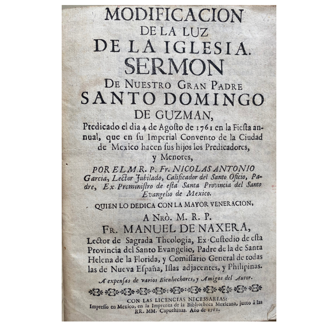 Modificación de la Luz de la Iglesia. Sermón – México, Imprenta de la Biblioteca Mexicana 1761
