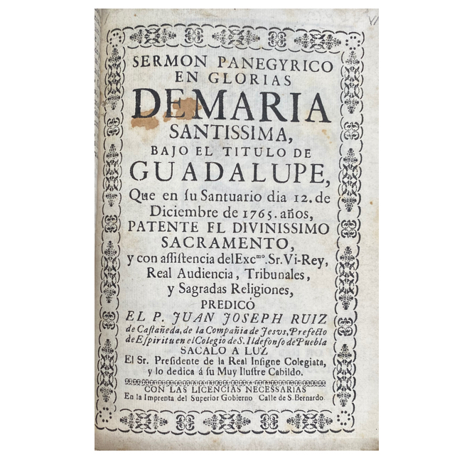 Sermón panegyrico en Glorias de María Santissima bajo el Titulo de Guadalupe – Imprenta del Superior Gobierno, 1765