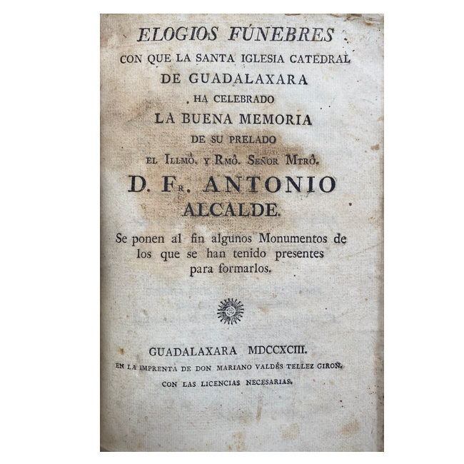 Elogios fúnebres (Fr Antonio Alcalde) – Guadalaxara, Imprenta de donMariano Valdés Tellez Girón, 1793