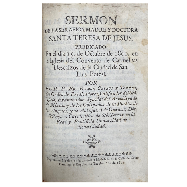 Sermón de la Serafica Madre y Doctora Santa Teresa de Jesús – México, Imprenta Madrileña, 1801