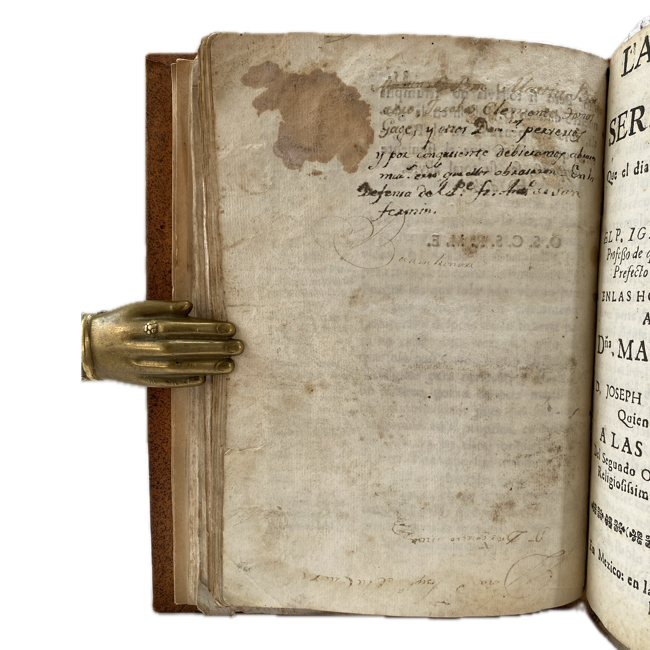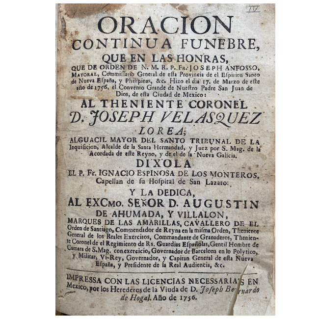 Oración Continua Fúnebre – México, Herederos de la Vda de Joseph Bernardo de Hogal, 1756. Rotura en página de título, sin afectación.