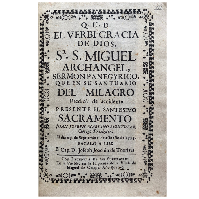 Q.U.D. La Verbigracia de Dios. Sr. San Miguel Archangel. Sermón Panegyrico– Puebla, Vda de Miguel de Ortega, , 1756