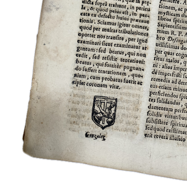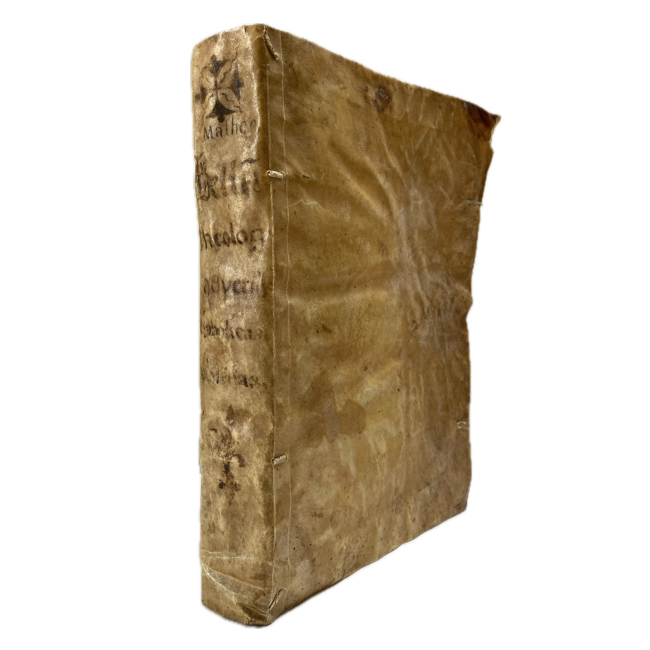 Folio (29 x 20 cm.): [14] h., 571 p., [8] h. Pergamino de época; rastros de broches; título manuscrito en lomo. Esquina inferior derecha de página de título con pérdida de papel, con reparación, sin afectación en textos; las tres primreas hojas con suciedad marginal; manchas de óxido ocasionales (foxing); letras capitulares ornamentales y viñetas decorativas al inicio de capítulos. Textos en latín.