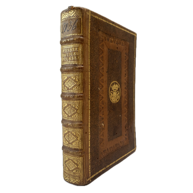 8º. [4] h, 323, [29] p. Encuadernación tipo Cambridge en espejo, nervios realzados, cuajado de dorados en lomo; marcos en dorados y gofrados en ambas tapas; pequeña etiqueta en parte superior de lomo; tapa frontal con escudo de nobleza al centro; afectada por punto de polilla. Primeras 50 [h] con dos pequeños puntos de polilla que no afectan, por lo demás un ejemplar limpio y agradable.