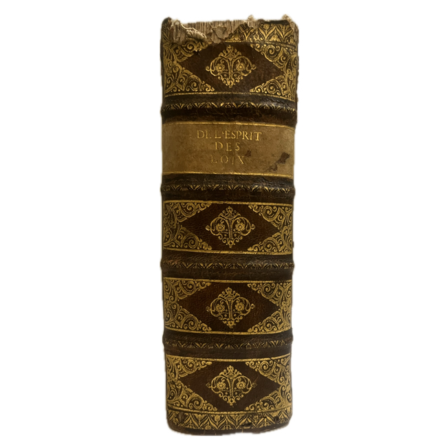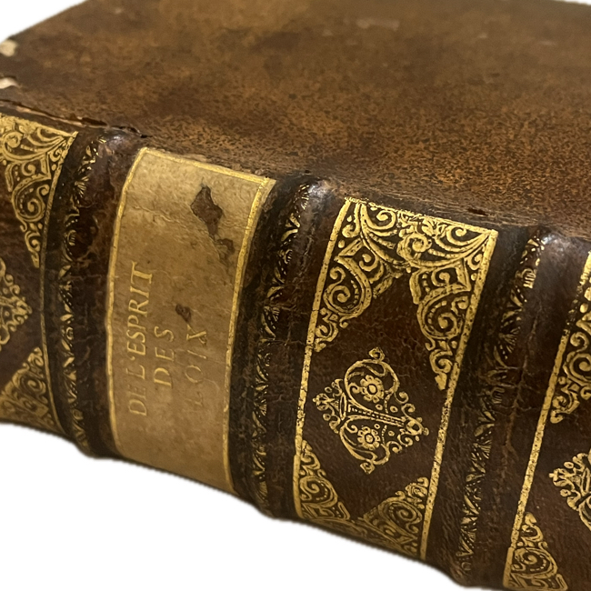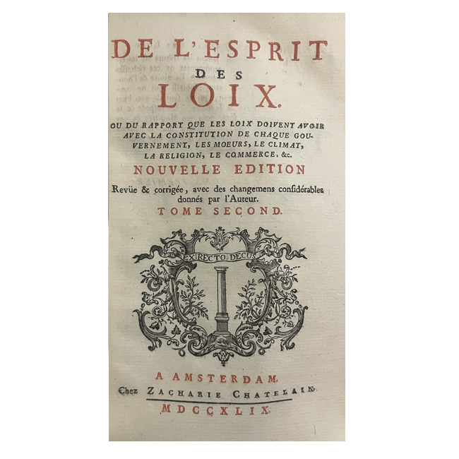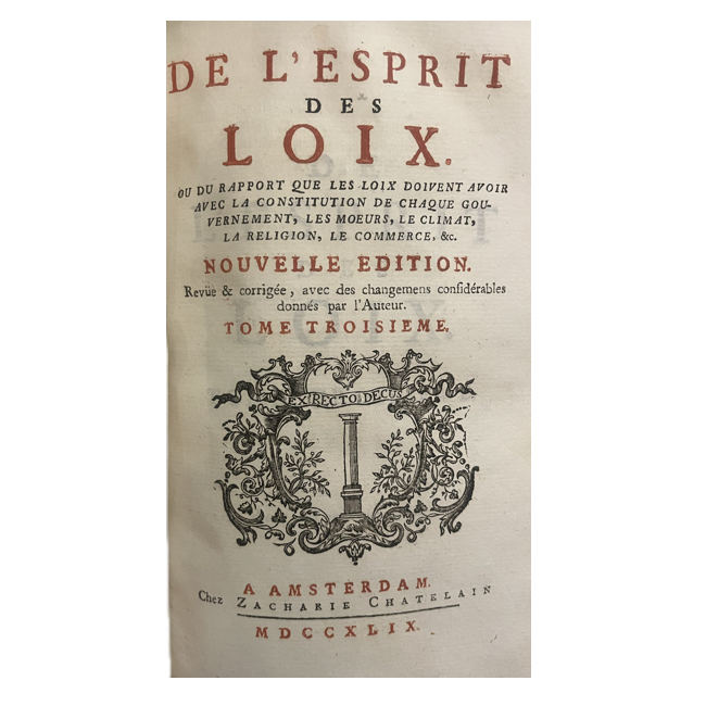 Primera edición de Ámsterdam, publicada un año después de la original y corregida por el autor, de esta obra fundamental, “[e]n muchos sentidos una de las obras más notables del siglo XVIII” (PMM 197), en la que el autor presenta su teoría de la monarquía constitucional, abogando por el constitucionalismo y la separación de poderes, y explica las leyes humanas y las instituciones sociales. Textos en francés
