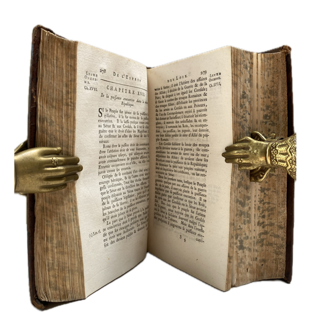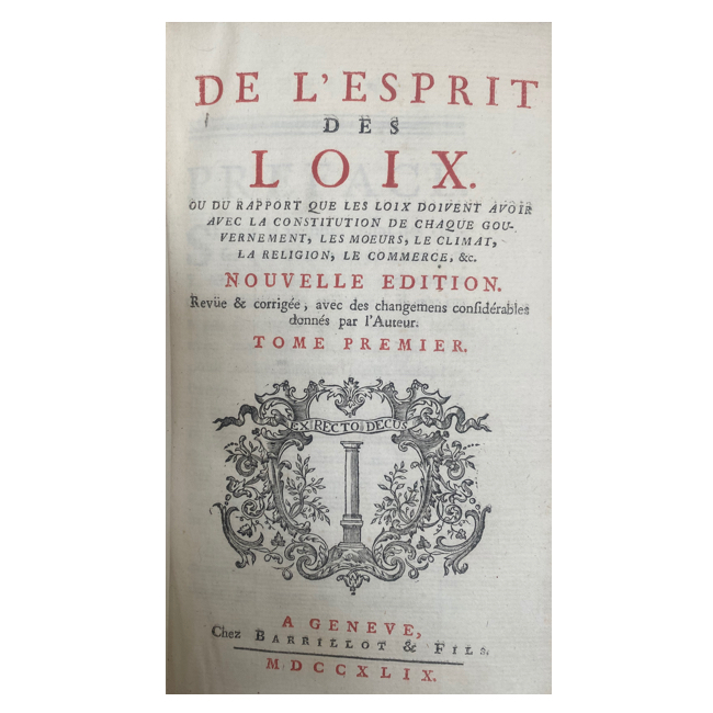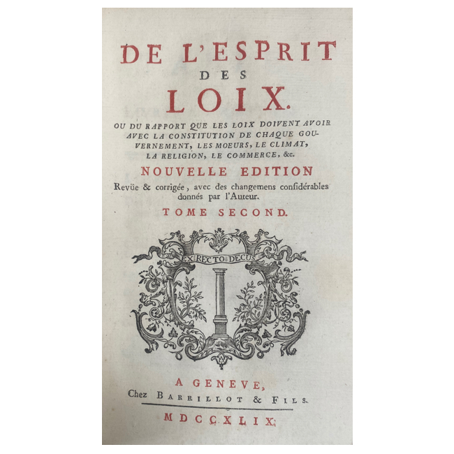 Nueva edición, revisada y corregida en tres partes. Edición temprana, publicada un año después de la original y corregida por el autor, de esta obra seminal que, “en muchos sentidos, es una de las obras más notables del siglo XVIII” (PMM 197). En ella Montesquieu presenta su teoría de la monarquía constitucional, defendiendo el constitucionalismo y la separación de poderes, y analiza las leyes humanas y las instituciones sociales. Textos en francés