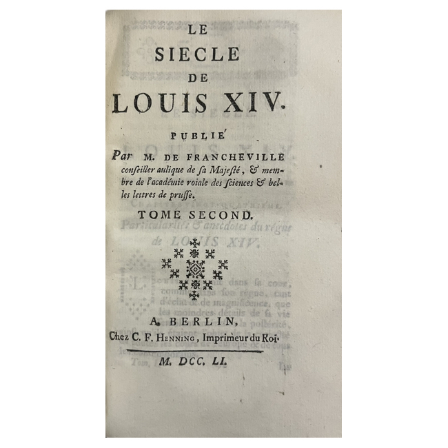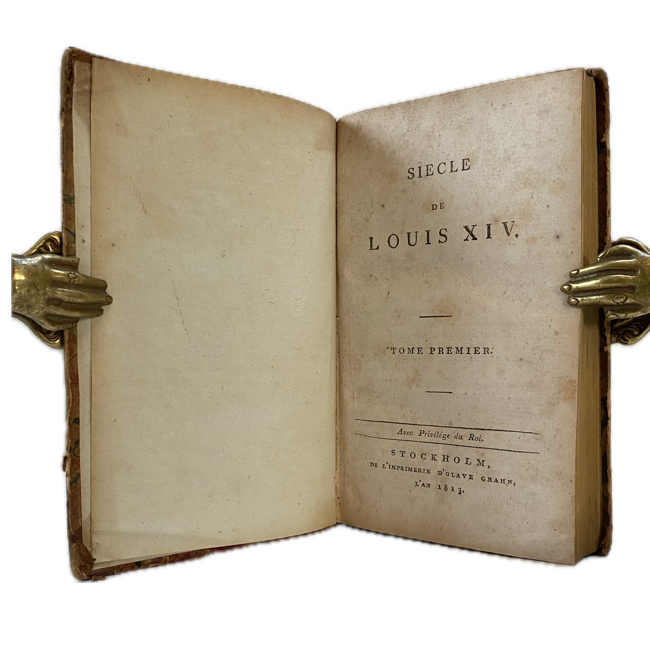 Primera edición de una de las obras históricas más importantes de Voltaire, considerada una de las historias políticas y culturales más relevantes de su época: un monumento a la historiografía del siglo XVIII que sentó las bases no solo para la historiografía moderna, sino también para la historia literaria en general. En consonancia con otros autores y filósofos de la Ilustración, Voltaire consideraba la época de Alejandro Magno y Pericles, la de César y Augusto, y el Renacimiento italiano como «grandes épocas». En esta obra, presenta la época de Luis XIV como la cuarta y más importante.