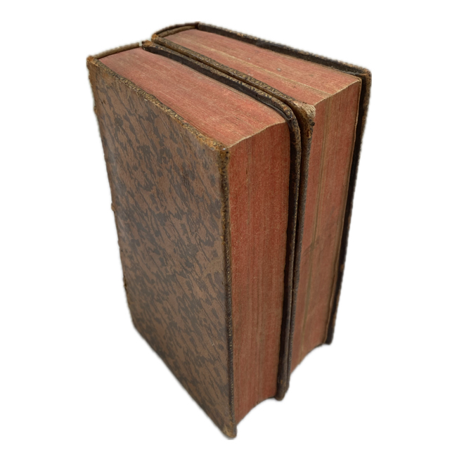 8º. Dos tomos: vii, 454 p.; viii, 412 p. Encuadernación de época en plena piel mestiza; nervios realzados y tejuelos en lomos; cantos color rojo. Interiores muy limpios, bien marginados y conservados. Cada tomo inicia con una viñeta tipográfica barroca con corona real, flores de lis y un manicule, símbolos de la monarquía y del carácter oficial del texto. Viñetas y letras capitulares ornamentales a lo largo de textos.
