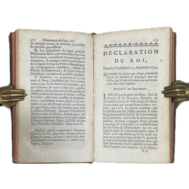 Es una recopilación oficial de las ordenanzas, reglamentos y disposiciones del reinado de Luis XV de Francia (1710–1774). Incluye aspectos de justicia, policía, finanzas, jurisdicción eclesiástica y materias de interés general, organizados de forma cronológica. Esta edición concreta además está corregida y considerablemente aumentada respecto a anteriores, e incorpora el “Traité des légitimes suivant le droit Romain”, tratado sobre sucesiones y derechos hereditarios.