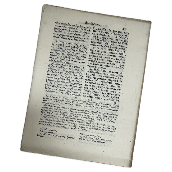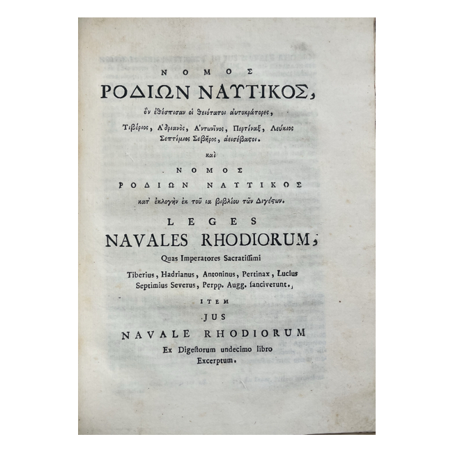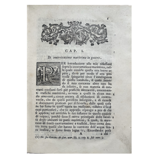 Una excelente edición posterior a la primera de 1692, enriquecida con las Leyes de Rodas (ius navale Rhodiorum), con el texto griego y la traducción latina, y con los Estatutos de los Oficiales de Seguridad de Florencia (Uffiziali di Sicurtà). La obra es fruto de la amplia experiencia profesional de este jurista genovés, adquirida en particular en el Tribunal de los Conservadores del Mar. La obra, compuesta por 102 capítulos, se presenta como un manual de fácil lectura con numerosas referencias a las instituciones marítimas de numerosos países, como Inglaterra y Holanda, y frecuentes citas de juristas como Baldo, Peck, Stracca, Loccenius, etc. Kress it., etc. 305. Olschki, II, 518. Bibl. Mansutti, 1582 ITA.