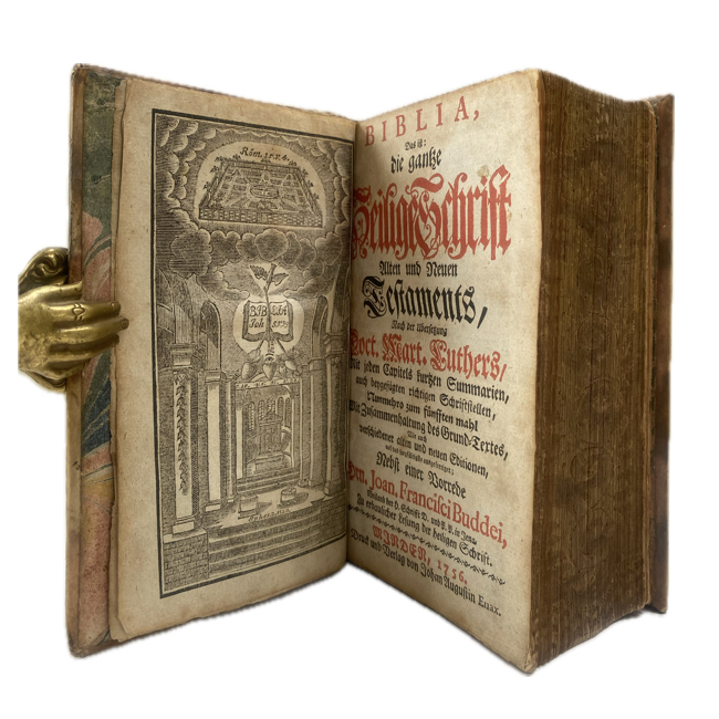 Biblia, Das ist die gantze heilige Schrift Alten und Neuen Testaments, nach der Übersetzung Mart. Luthers… Nummehro zum fünfften mahl mit Zusammenhaltung des Grund=Texte, wie auch verschiedener alten und neuen Editionen, auf das sorgfältigste ausgefertiget; nebst einer Vorrede Joan. Francisci Buddei,…