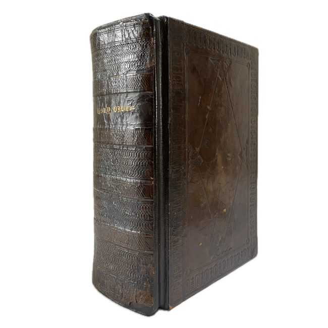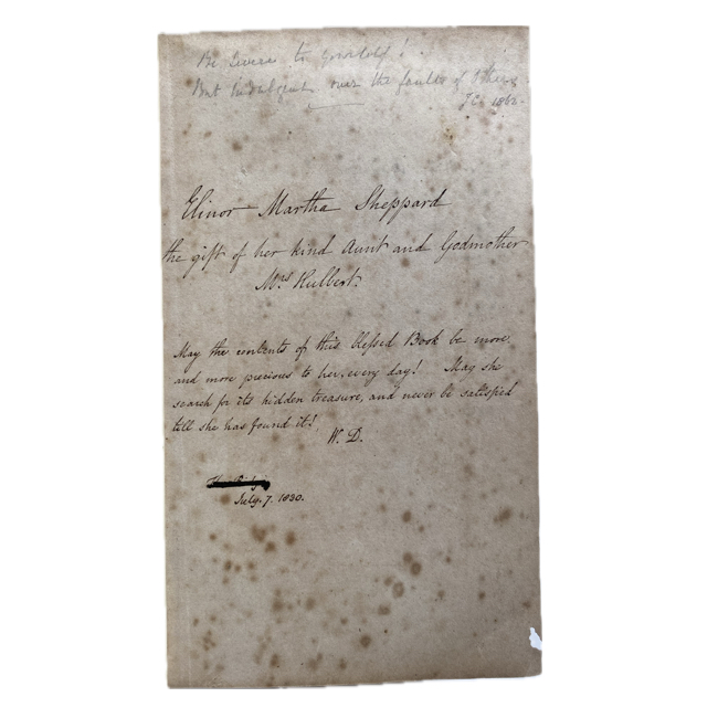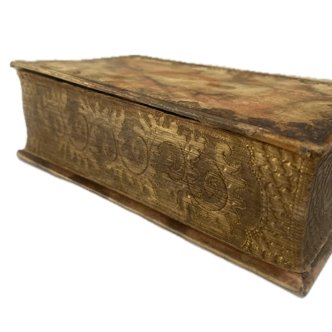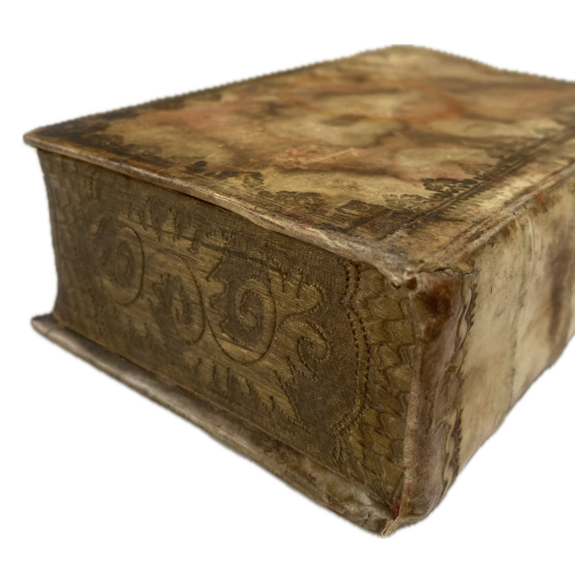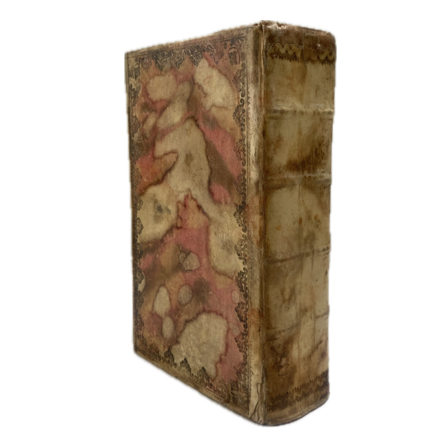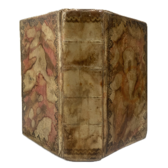 8º menor (17 x 10 cm). Dos tomos en un volumen:  [8] h., 944 p; 285 p.,[1] h.   Bellísimo pergamino completo de época, con las cubiertas marmoleadas en colores suaves y enmarcadas por un amplio borde gofrado. Guardas pintadas a mano; cantos dorados y ricamente decorados con hierros; extremos del lomo con estampado en seco. Frontispicio grabado; página de título Antiguo Testamento a dos tintas; pequeño grabado de Jesús en la cruz en página de título del Nuevo Testamento; textos a dos columnas; algunas manchas pardas dispersas.