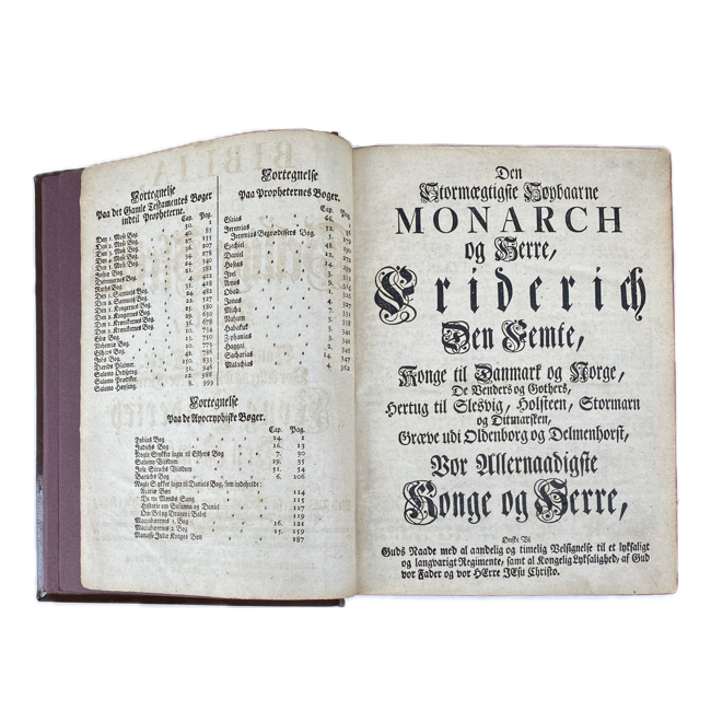 Biblia, det er Den gandske Hellige Skriftes Bøger, ved Hans Kongel. Majests. Vor Allernaadigste Arve-Herres Kong Friderich den Femtes christlige Omsorg, (…)