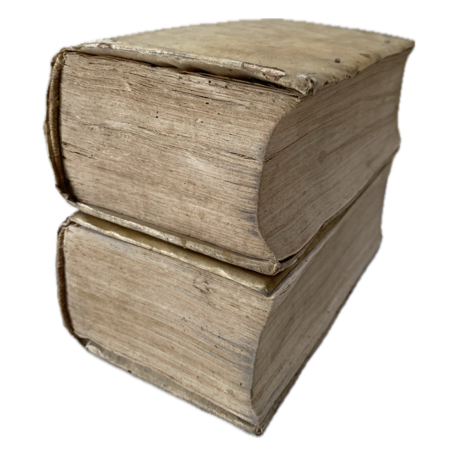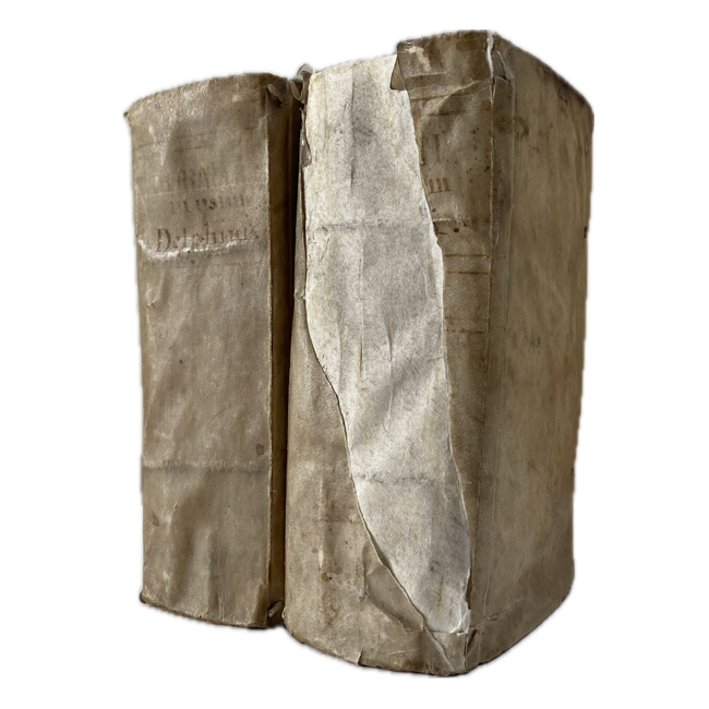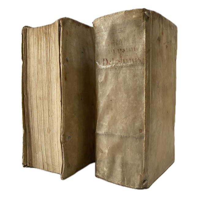 8º. 2 Vol. con numeración continua. 1671 p. Pergamino de época; texto manuscrito casi ilegible en lomo de Tomo I; el lomo del Tomo II falto de piel, pero la encuadernación firme. Viñeta tipográfica en página de título; interiores muy limpios y bien conservados.