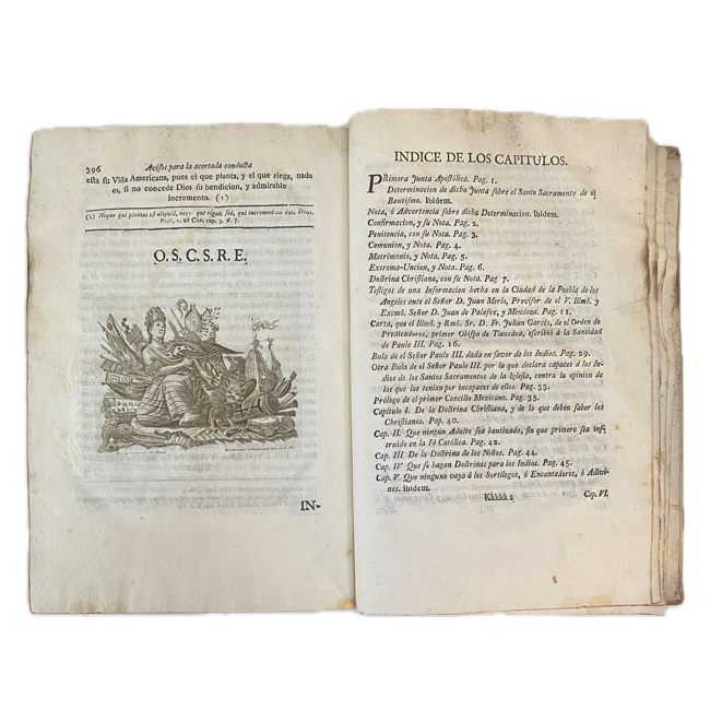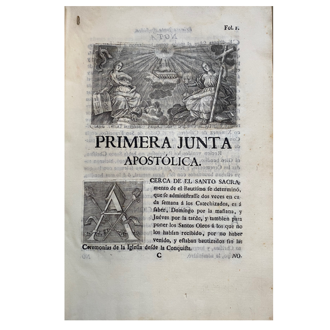 El primer Concilio fue impreso originalmente en 1556, en México, por Juan Pablos Lombardo. Además de los dos Concilios, el primer volumen contiene un relato de los Prelados de la Iglesia mexicana. ” (Sabin) “Precediendo a las Constituciones de los concilios está la carta pastoral del editor que relata brevemente los objetos de dichos concilios y da la historia de los celebrados en México. A continuación aparecen las resoluciones de la primera junta apostólica y la curiosa información del capitán Juan Juárez y Gamboa en 1649 sobre la llegada de los primeros clérigos a la Nueva España; Carta del obispo Garcés a Paulo III a favor de los indígenas y luego la bula del Papa de 1537 declarando a los indios seres racionales.
