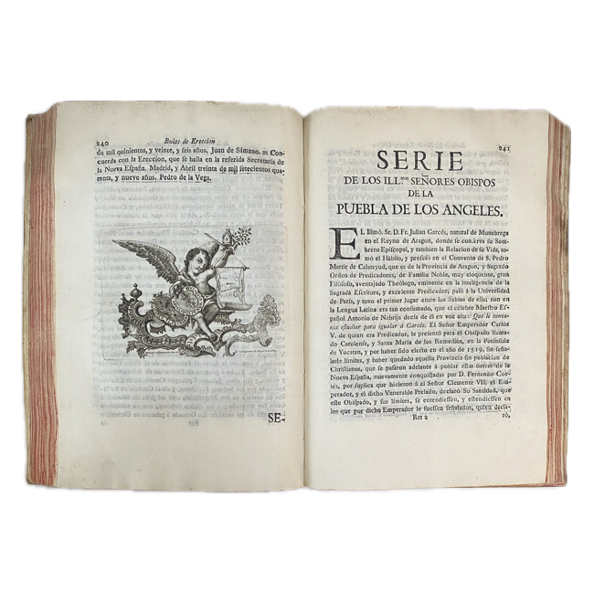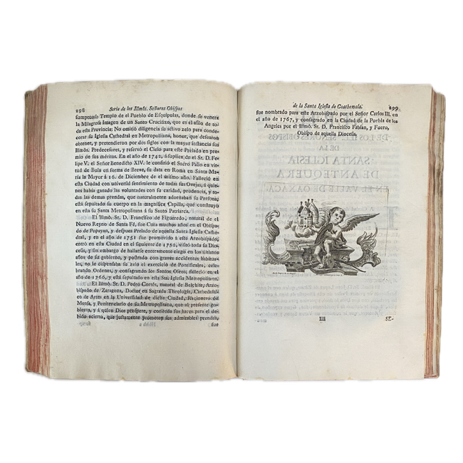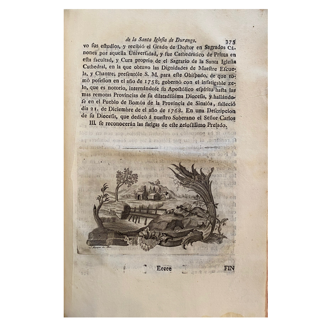 4º mayor. [5] h. 396 p., [8] h. Pergamino rígido de época; rastro de tejuelo en lomo; manchas de suciedad en tapas; pequeña rotura en cada tapa, que no afecta a la encuadernación. Punto de polilla presente en primeras hojas, sin afectación; página de título a dos tintas con grabado firmado “Hogal” y antiguo nombre manuscrito (ilegible) ; al reverso una etiqueta de papel antigua a manera de exlibris; viñetas grabadas en p.1 y siete grabados a media página, por Emmanuel Villavicencio; algunas capitulares y viñetas ornamentales.